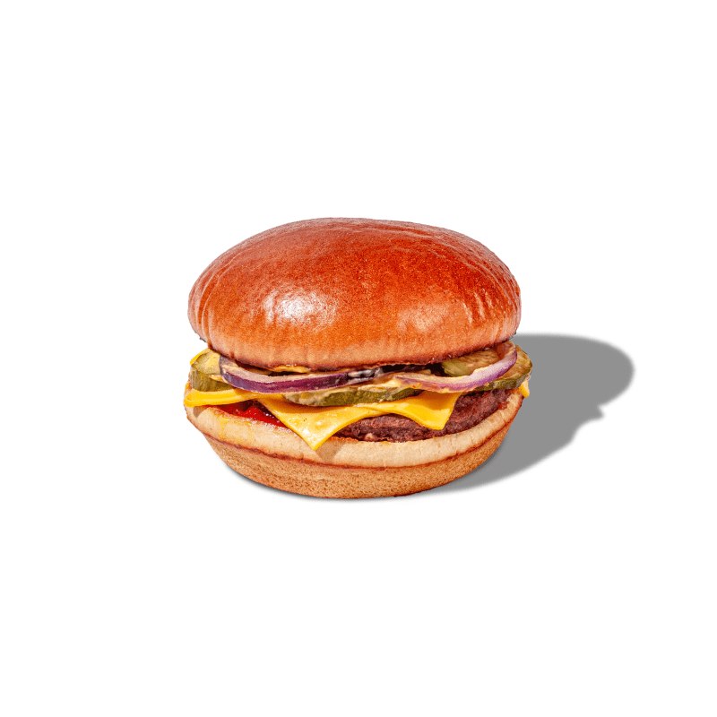 Булочка, котлета из говядины, айсберг, маринованые огурчики, красный лук, соус бургер, фирменый соус BBQ, сыр Чеддер